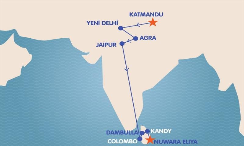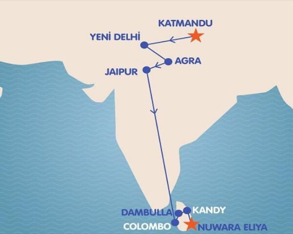 - Katmandu’da 2 gece, Delhi’de 1 gece, Jaipur’da 2 gece, Agra’da 1 gece, Dambulla’da 2 gece ve Kolombo’da 1 gece olmak üzere toplamda 9 gece kahvaltı dahil konaklama